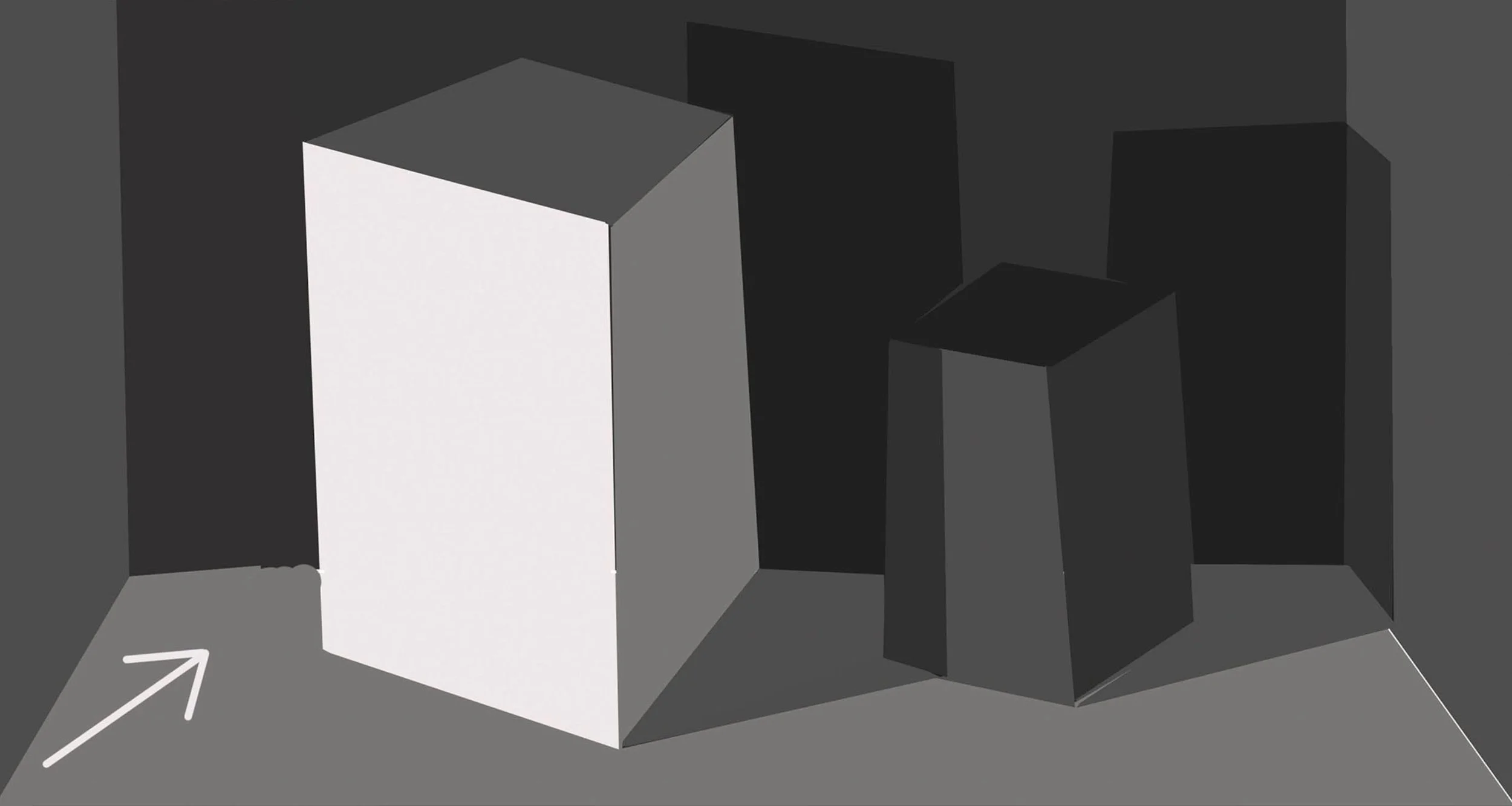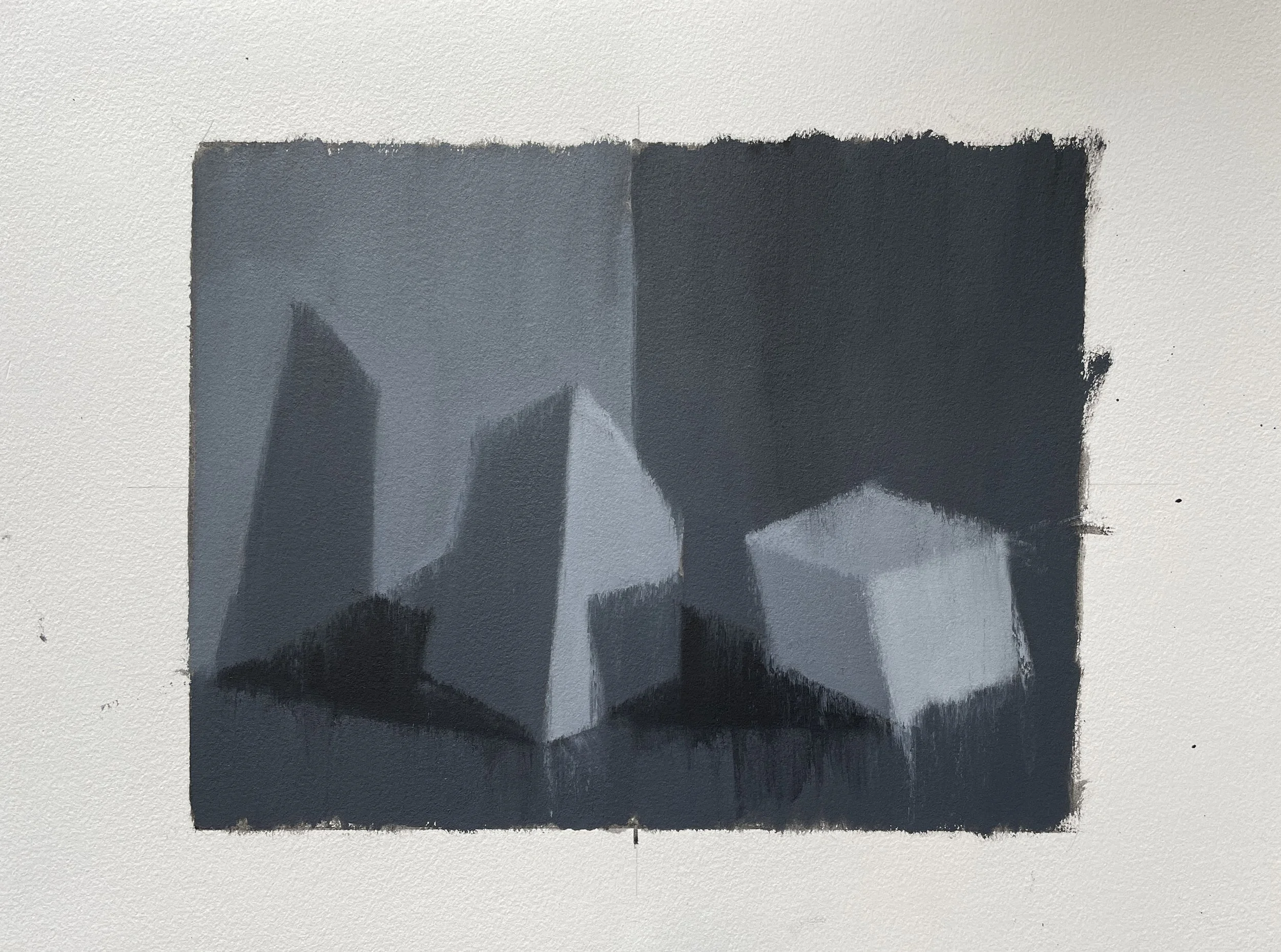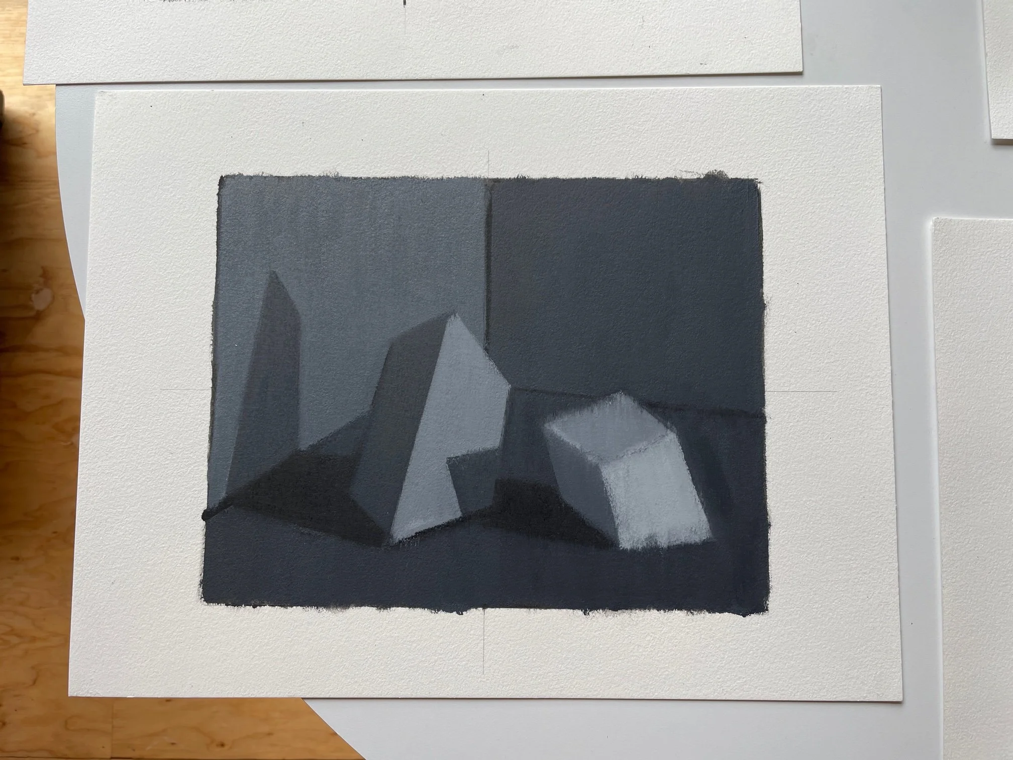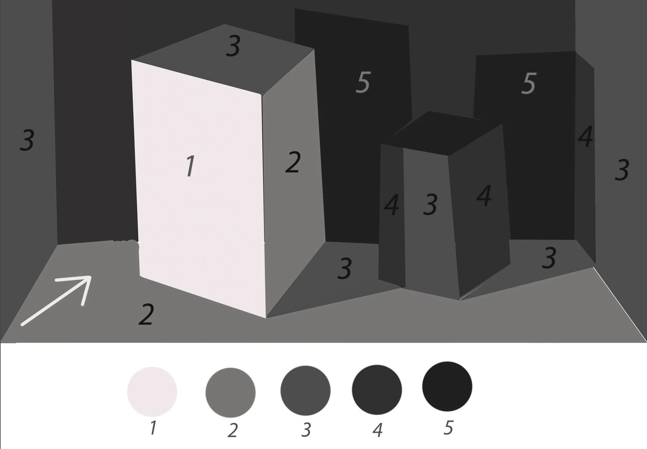 The labels “black wall”, “dark gray wall”, “light gray floor”, and “white box” are to indicate the relative value of these surfaces. Meaning, the shadow shape on the black wall must be your darkest value. The plane on the white box facing the direction of light will be your lightest value. The remaining value shapes fall somewhere in-between (use logic).