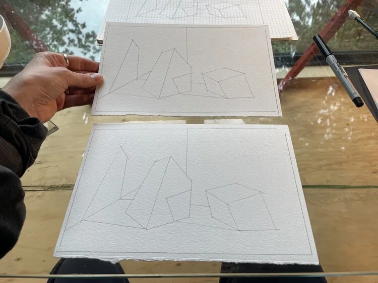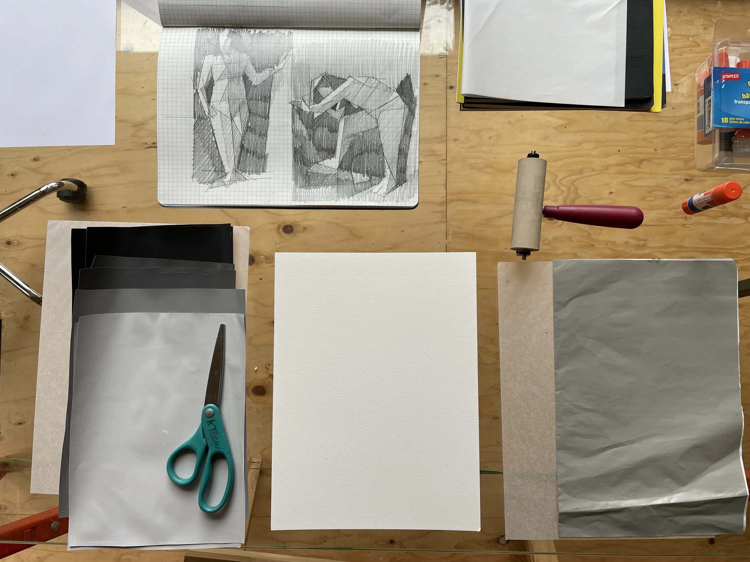 These templates will be used to make a series of gouache value paintings, so I am tracing the drawing onto watercolor paper. I’ve folded my paper in halves so they are the same size as my drawing. I tape the paper on top of the tracing paper, and trace-out a series of templates. You will want around 4-6 of these.
