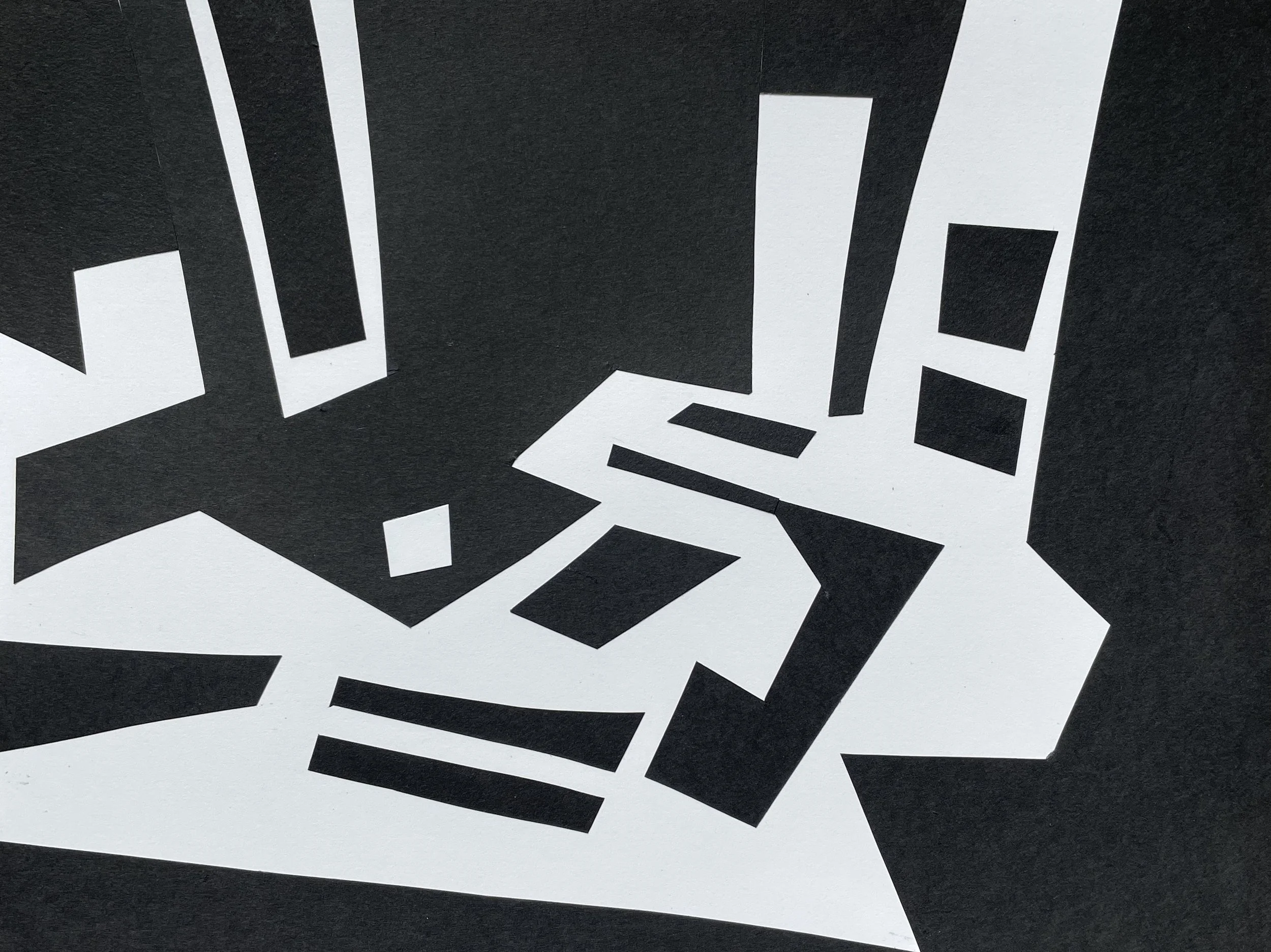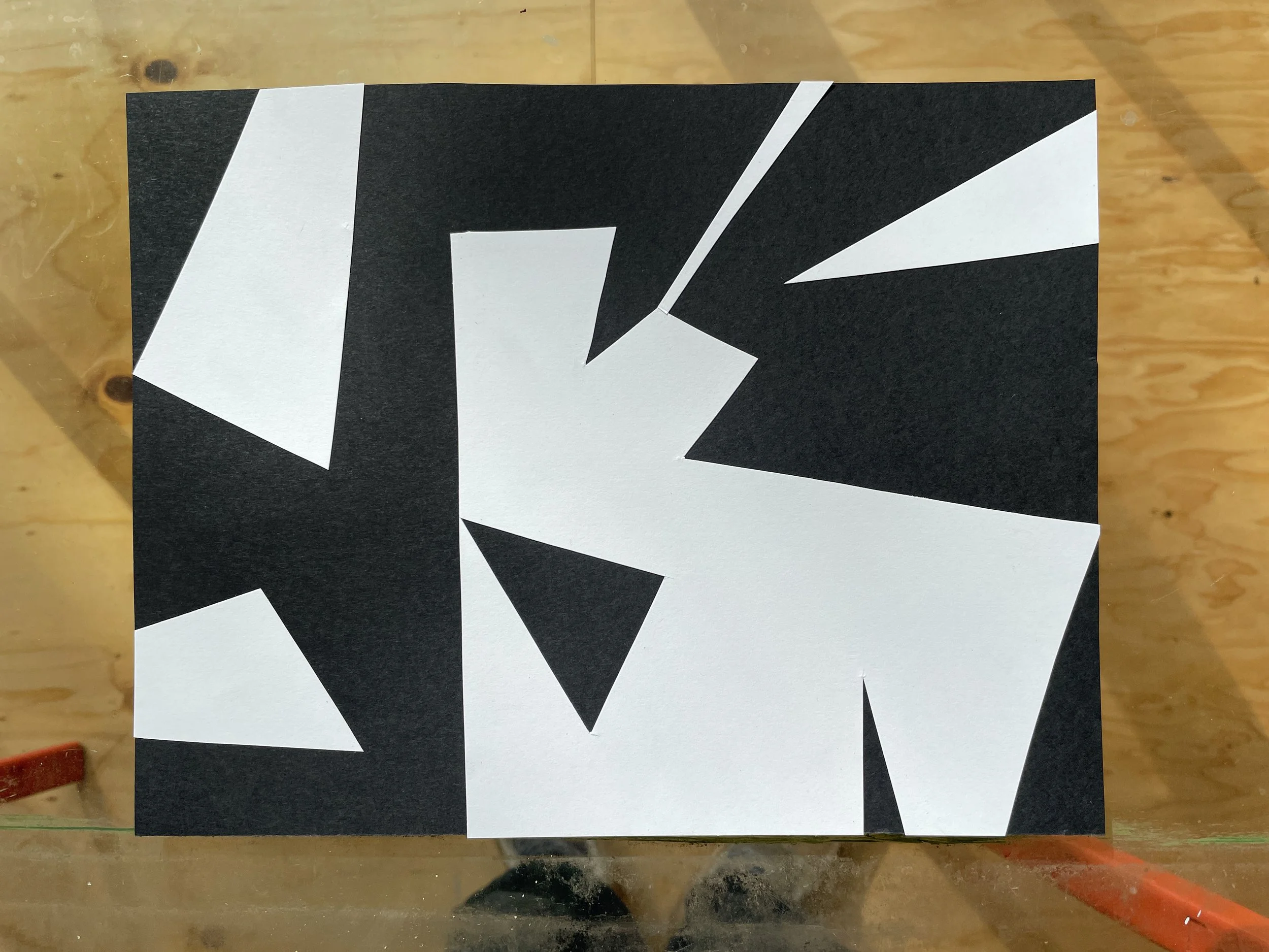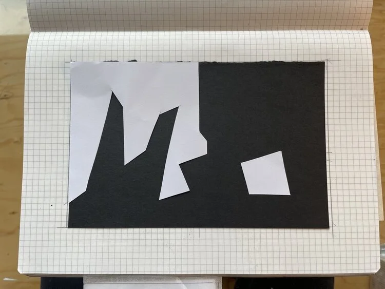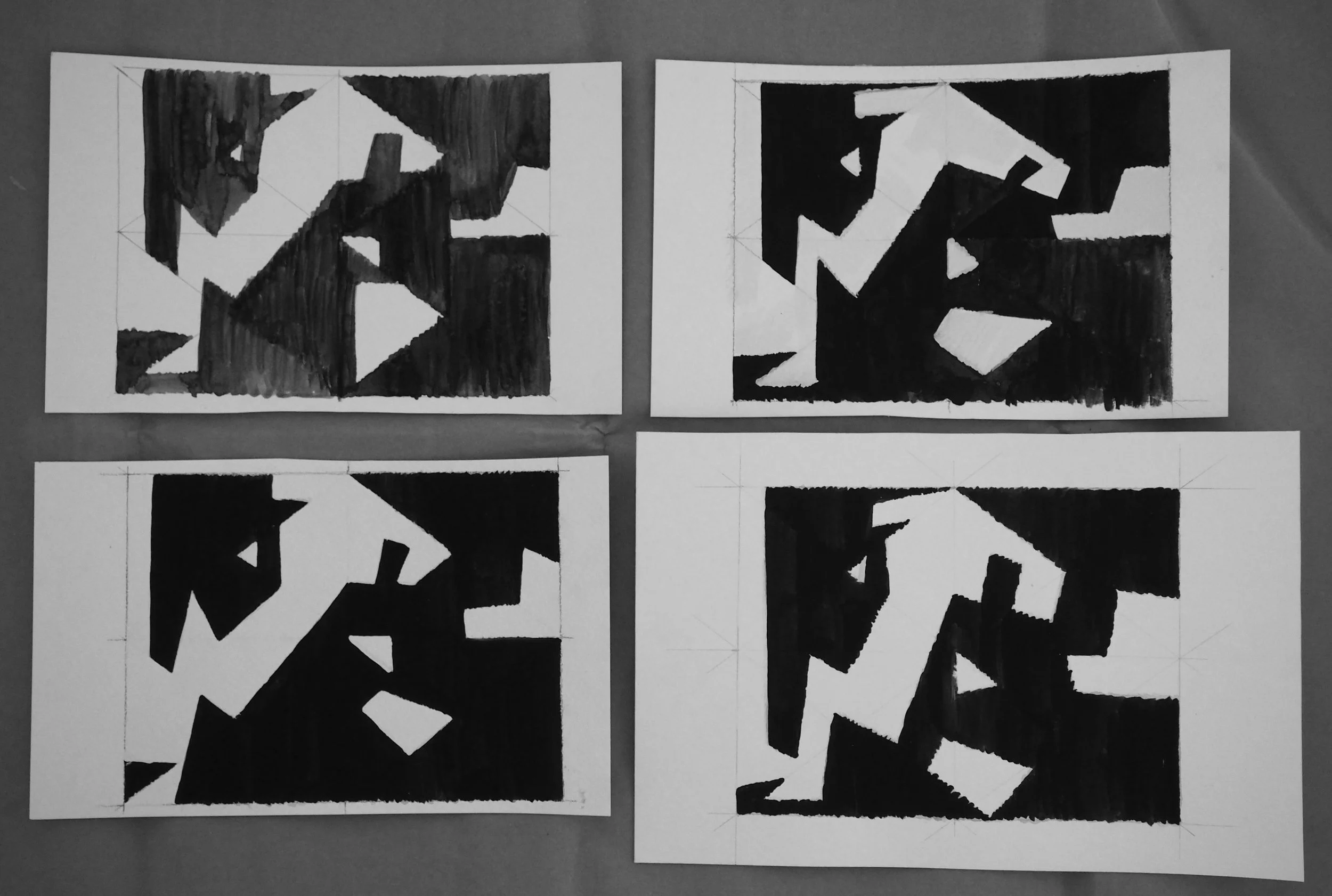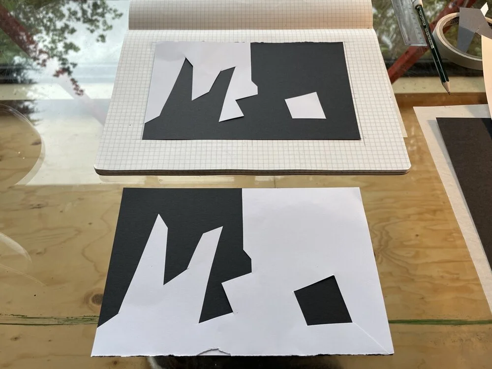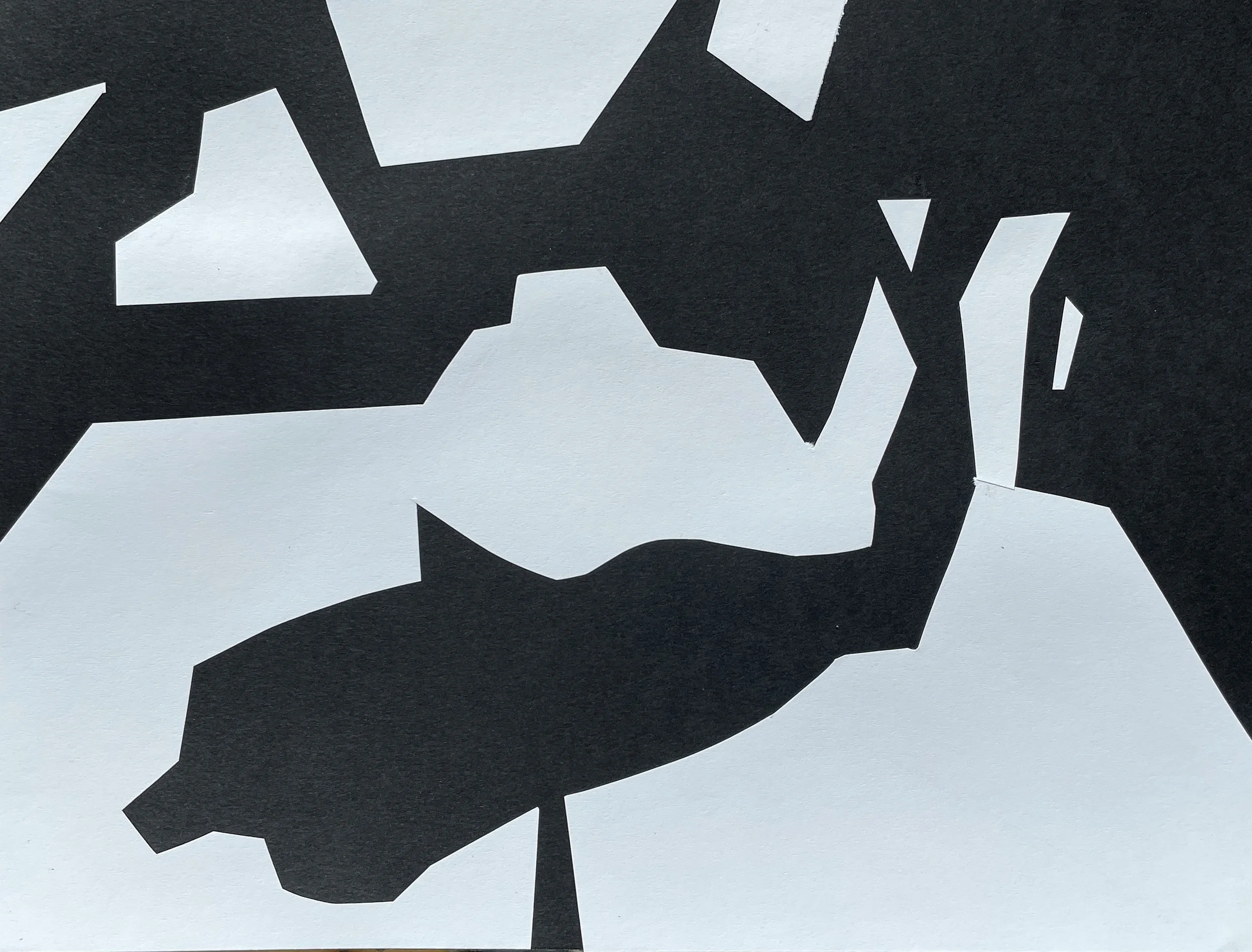 1. Cut out a series of white shapes and playfully arrange them on a sheet of black paper; Cut out a series of black shapes and playfully arrange them on a sheet of white paper. Pay special attention to the container of your rectangle and how your shapes interact with it.