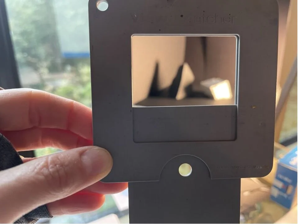 Looking at your theater of objects, crop-in far enough to fill your rectangle with your characters and their cast shadows. I like to use a viewfinder to do this. (The one shown here is called “view catcher,” which I have adjusted to mimic the horizontal shape of the rectangle on my page. You can also cut-out a rectangle from a pice of paper to peer through, or construct two “L” shapes out of cardboard to create your own viewfinder.)