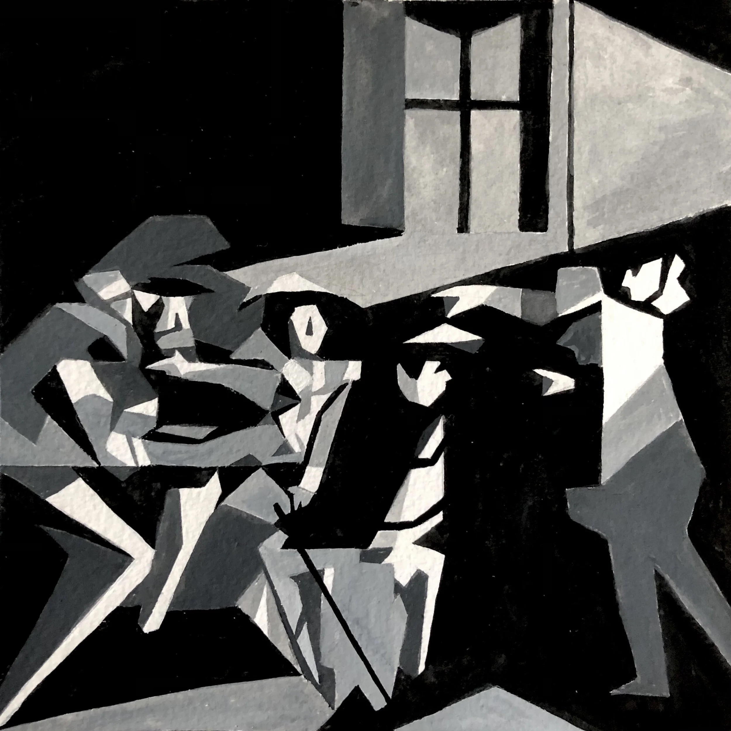 Make one form cast a shadow upon the other form. Imagine this shadow as one form “touching” the other, a kind of bridge that unites them. Create an overall pattern like this: form/ shadow/ form/ shadow. In my example, my final shadow climbs up the wall and becomes another character in the drama. Squint your eyes and look for compelling shapes of light and dark that both dissolve and announce the character-forms.