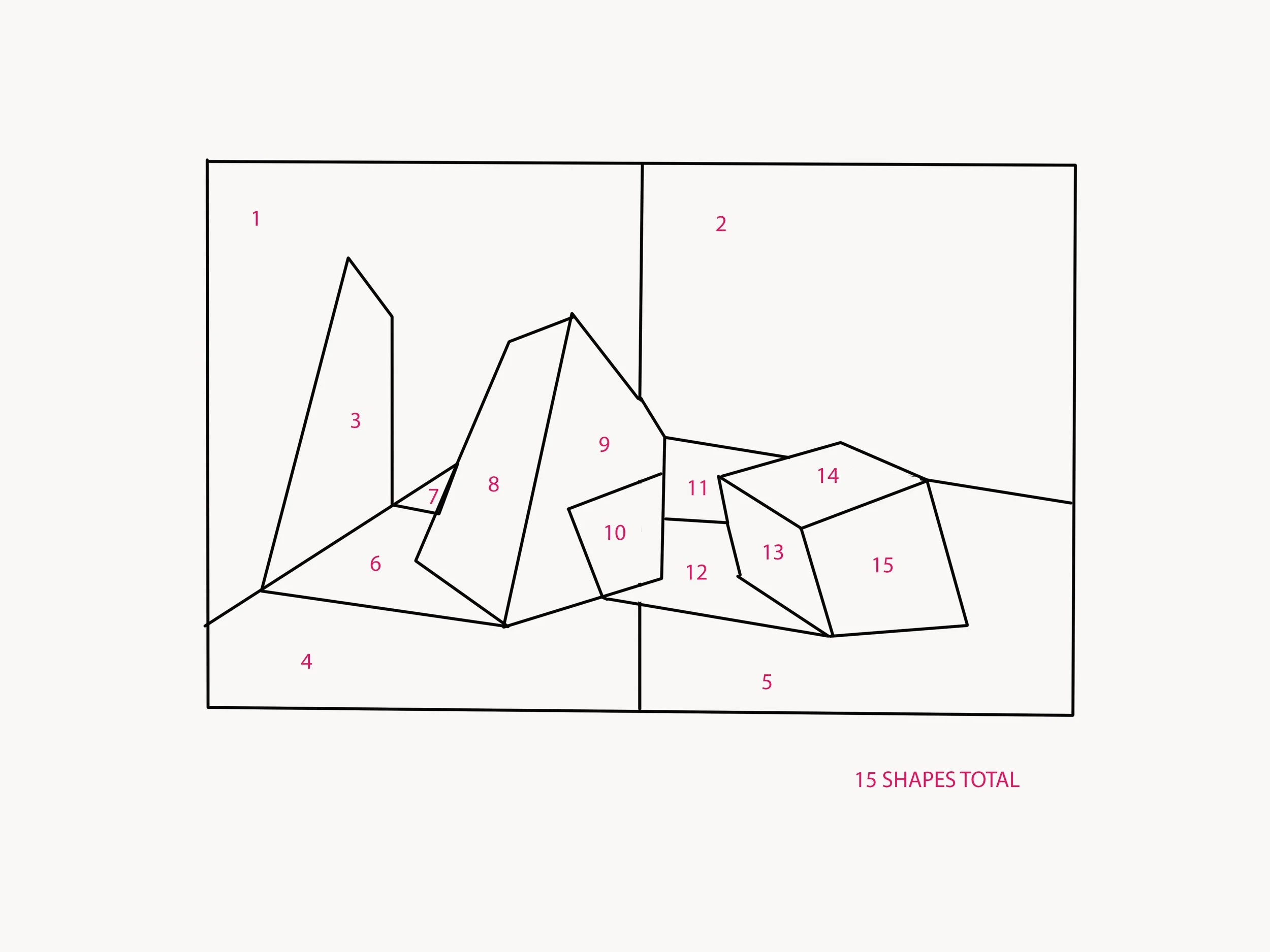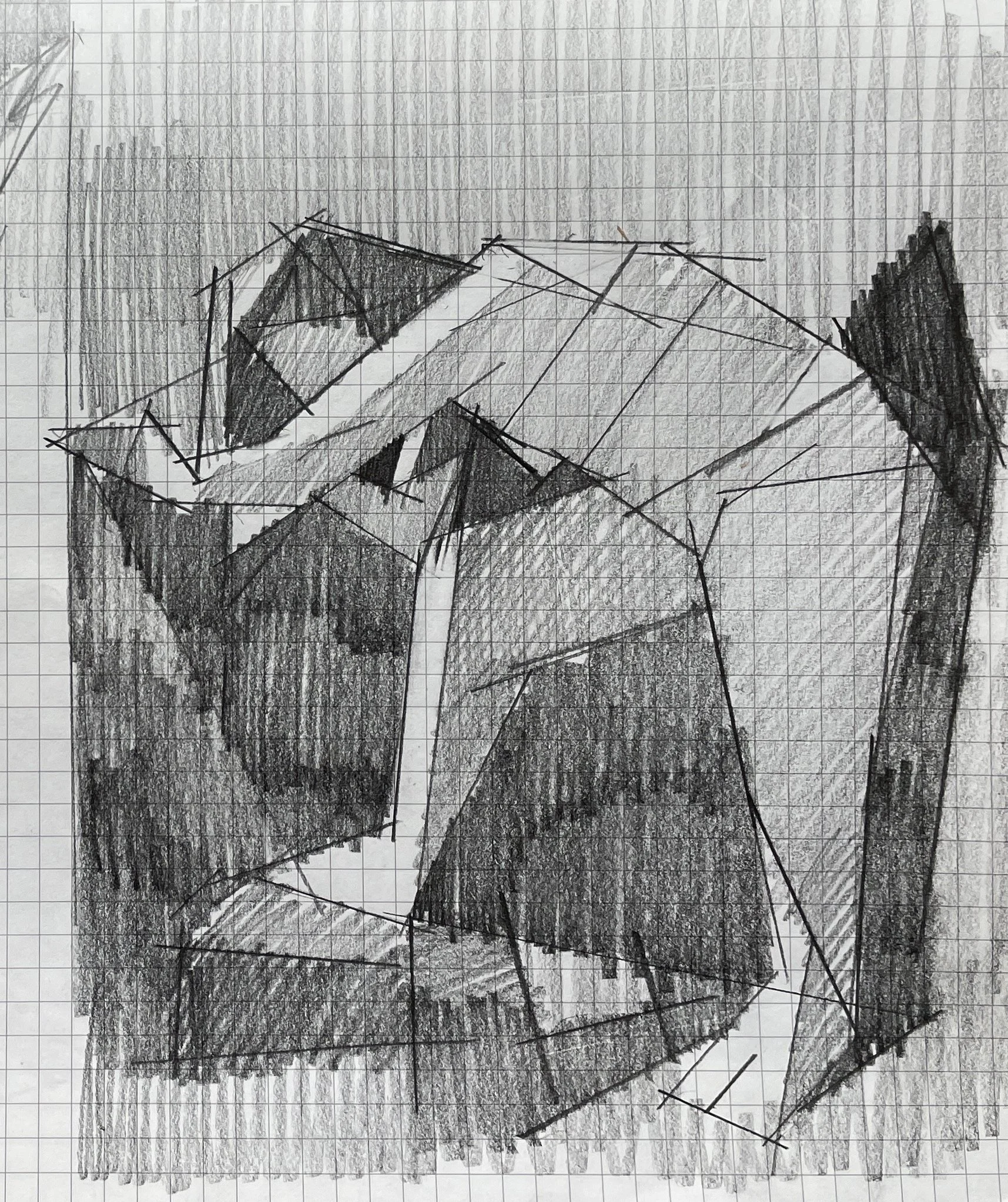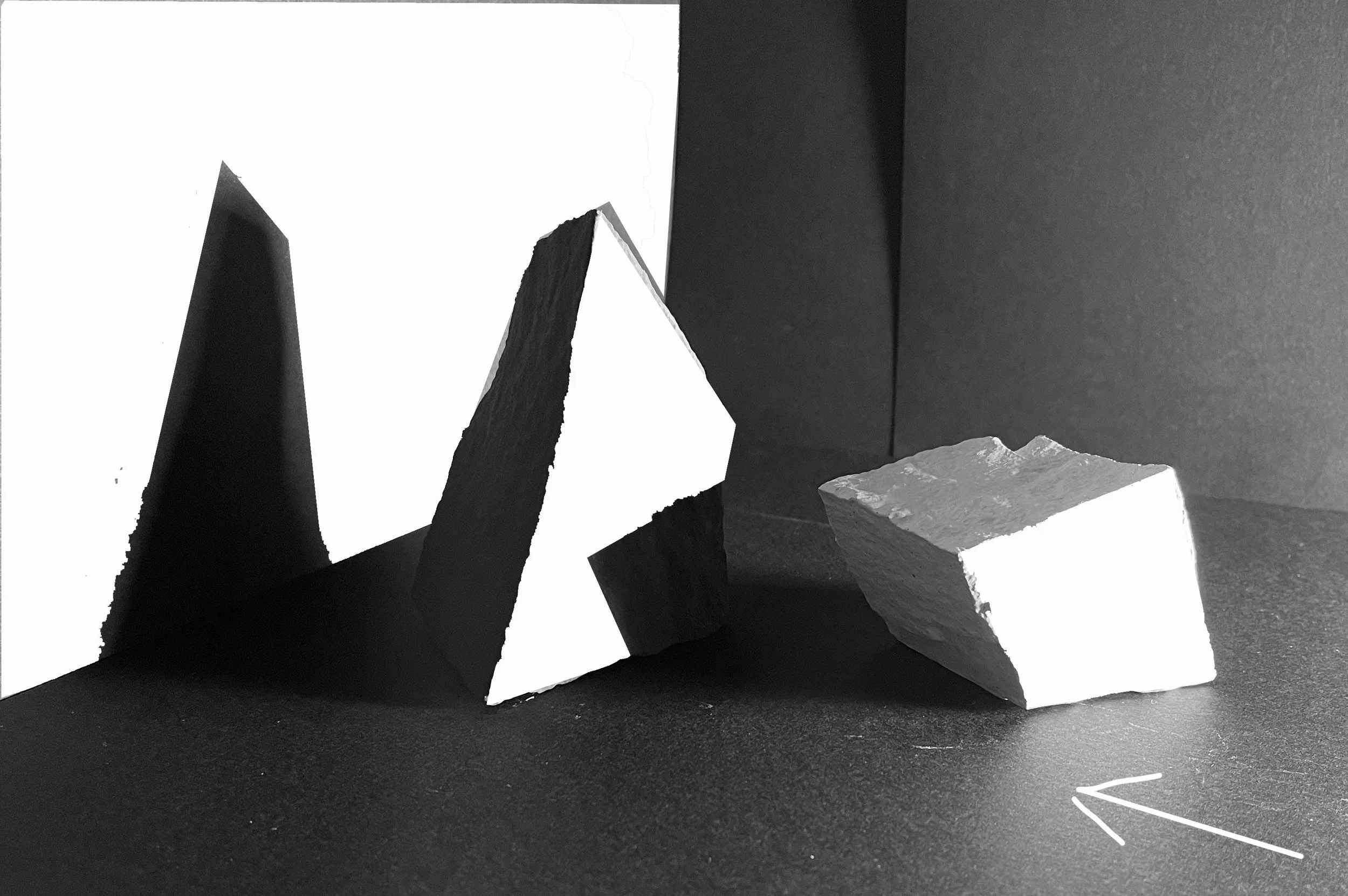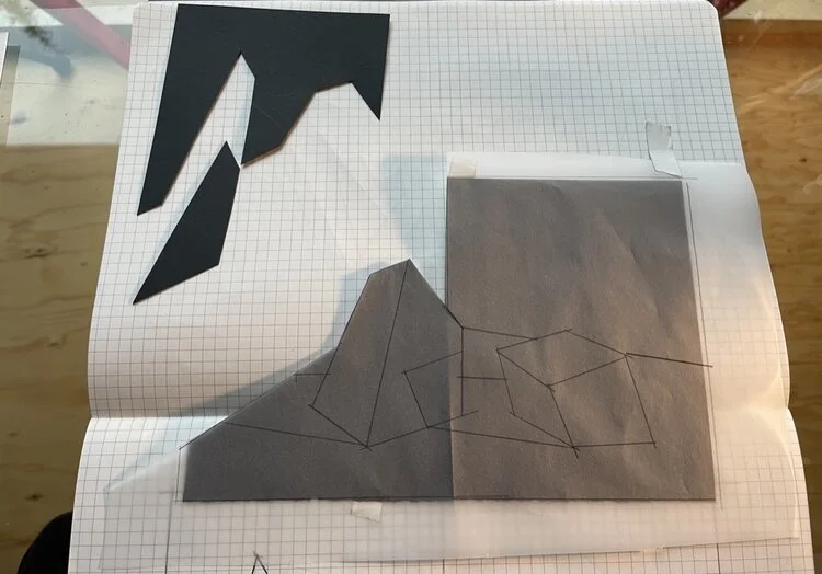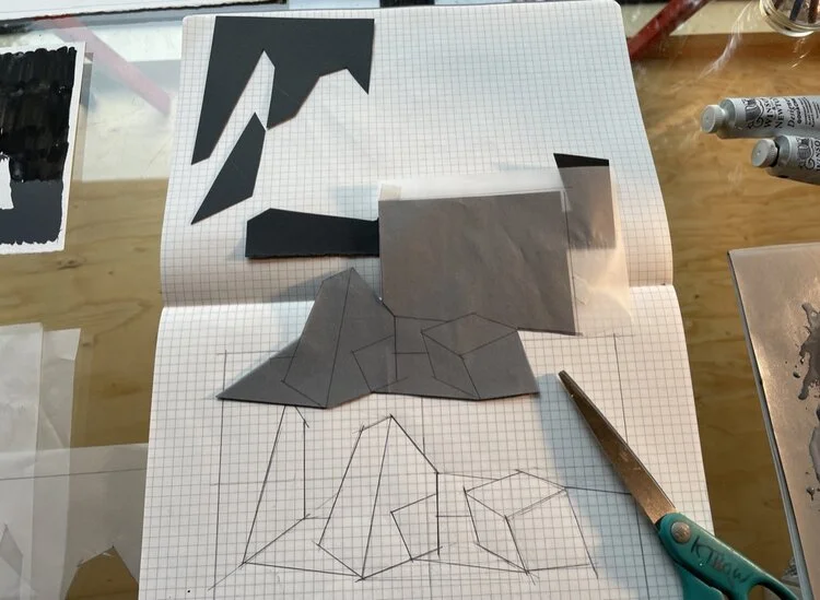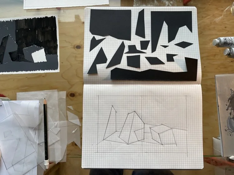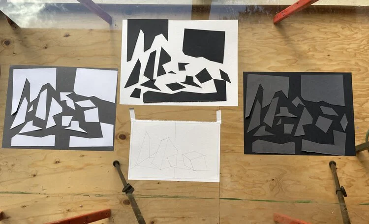 With simple, angled lines construct the dominant planes of your objects and the cast shadows they create. Your goal is to end up with a drawing made of distinct shapes that are easy to identify and can be cut-out with scissors!