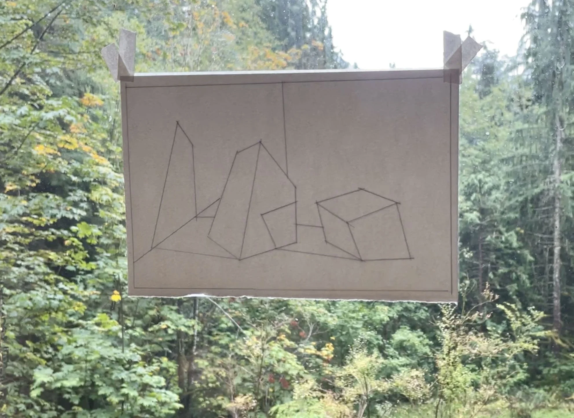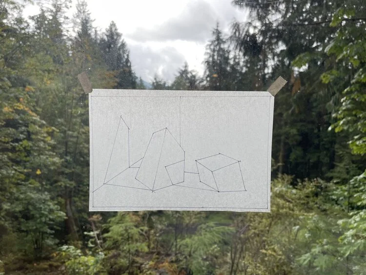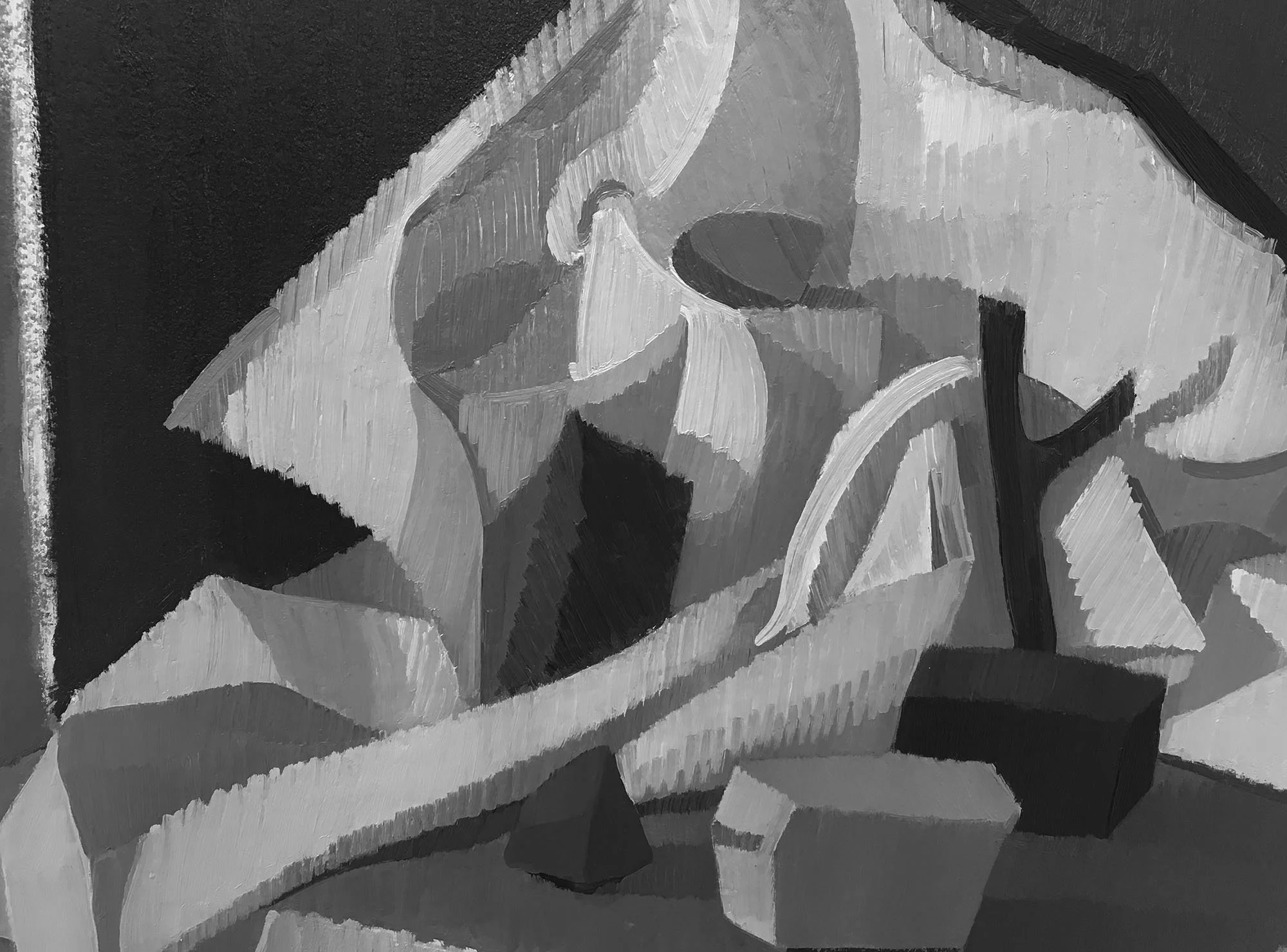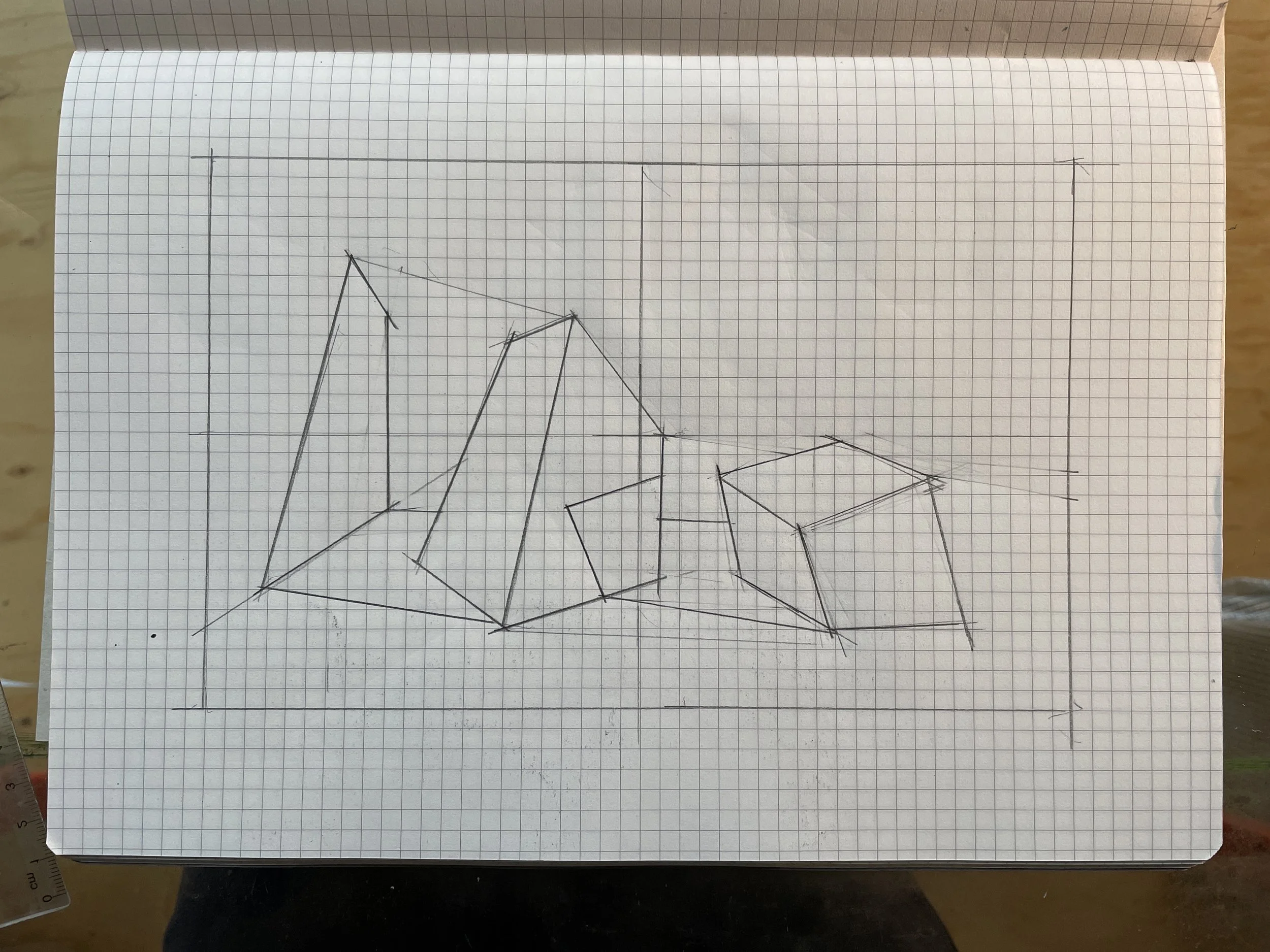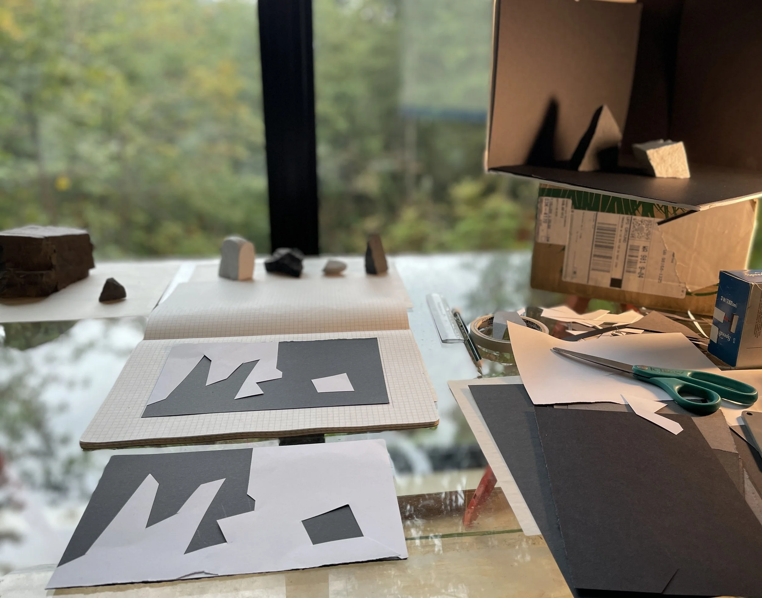 With simple, angled lines construct the dominant planes of your objects and the cast shadows they create. Your goal is to end up with a drawing made of distinct shapes that are easy to identify and can be cut-out with scissors!