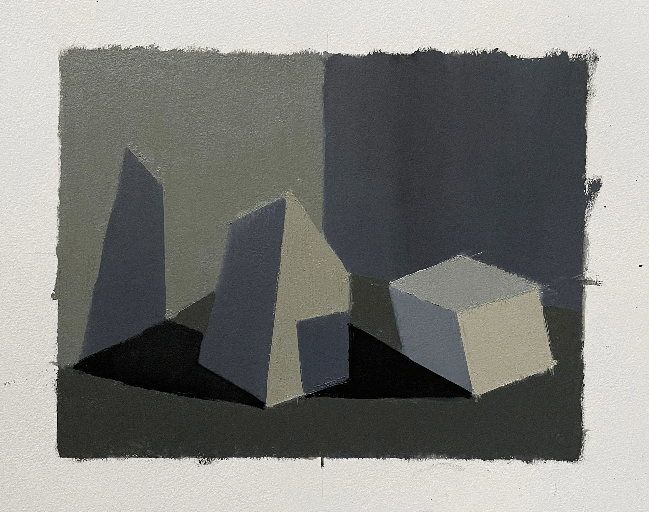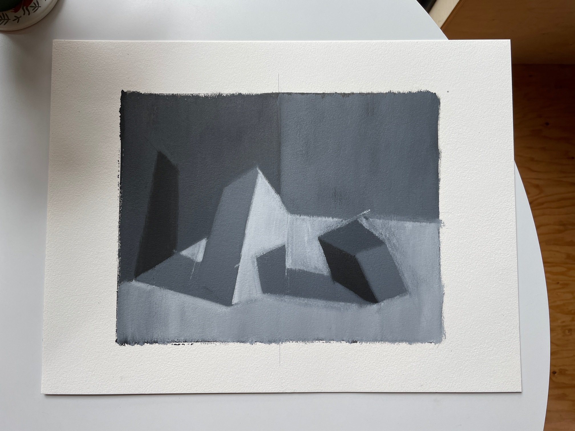 Using the limited number of shapes from your template, plus the limitation of only 3 values, create a series of painted studies that explore various “solutions” to your composition-puzzle.
