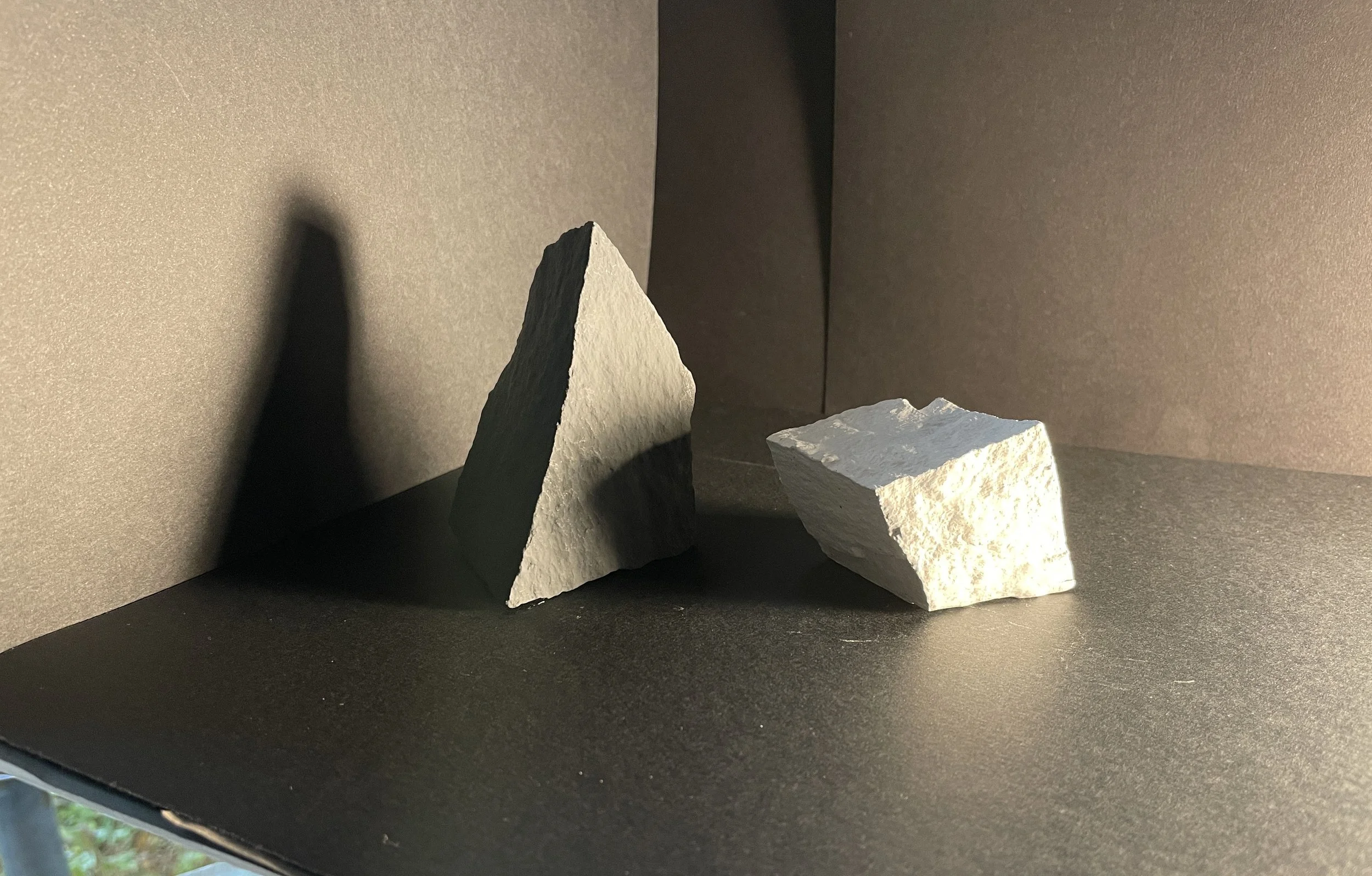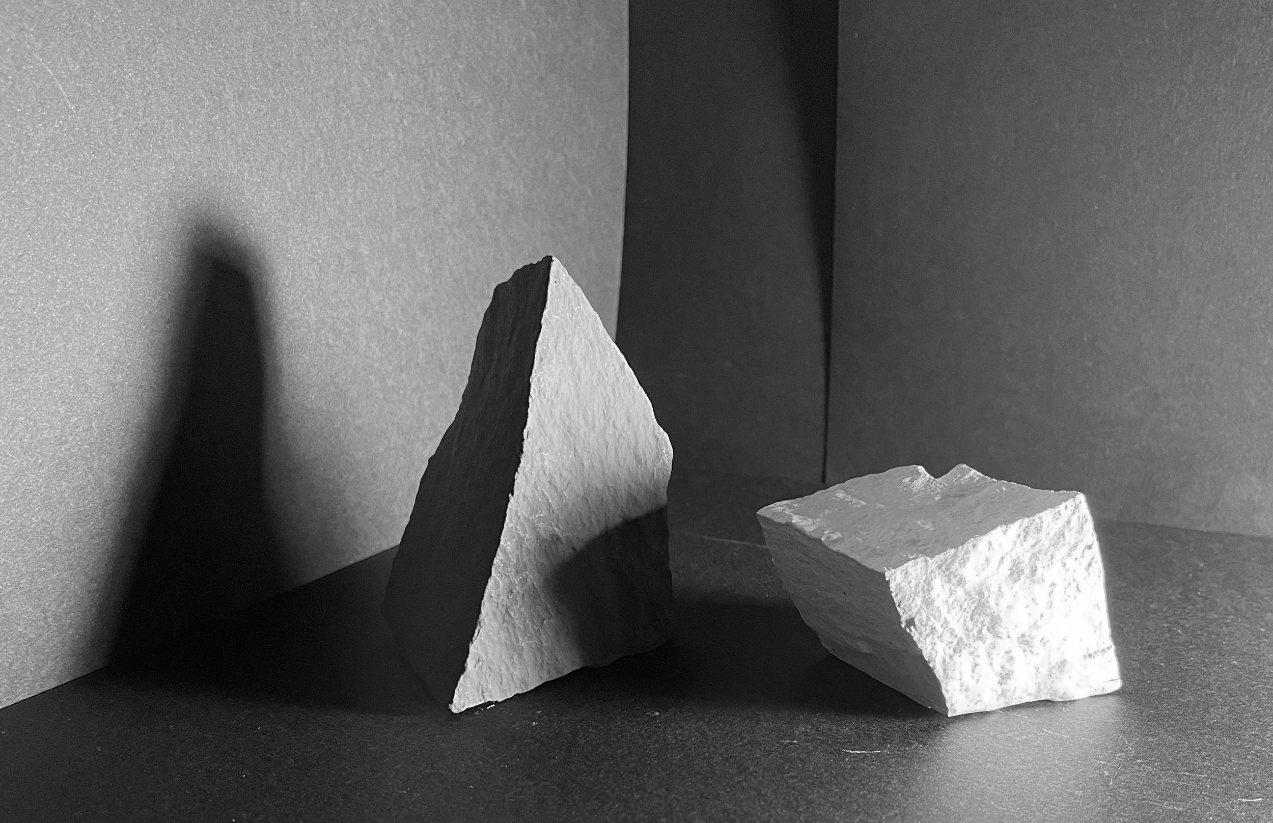 -Three-dimensional, planar, geometric forms are best. Rocks. Wood blocks. Chunks of Plaster. Found Objects. Make your own: splice and form them out of cardboard; hammer a hunk of concrete into shards; cast simple forms with air-dry clay; cut and bend aluminum or other metals, etc.