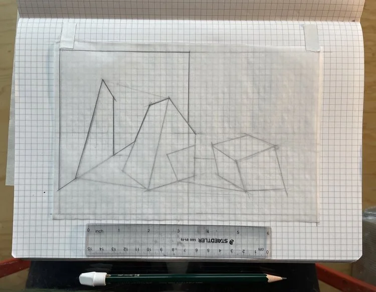 Identify the center lines of your view. These can be used as a visual “anchors” for setting-up your drawing. In my example, I am lining-up my vertical center line with the back corner of my still-life box. My horizontal center line intersects with the right-hand corner of my dark object, and also the top-most corner of my light object.