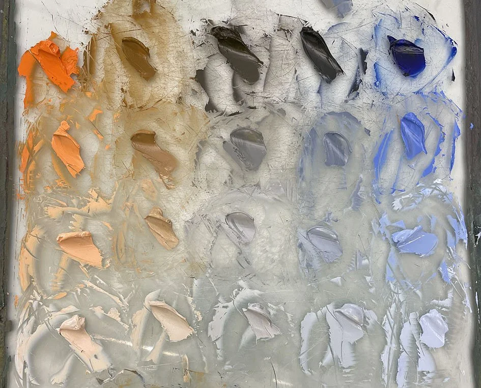 In this lesson you will learn how to mix a tertiary palette with the complement set Orange and Blue. You will learn how to create a color chart that notates the nuanced mixtures from your palette, and how to begin experimenting with those mixtures by applying them to a simple template.