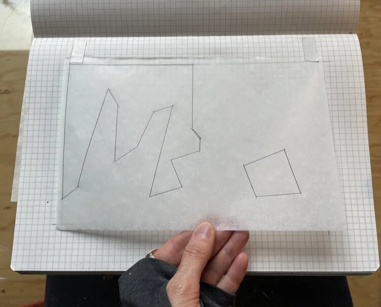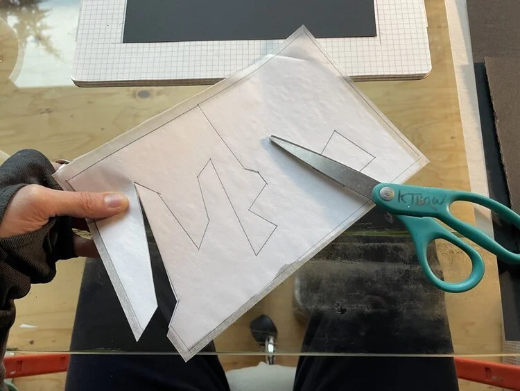 To prepare for our next lesson, we need to create several templates from our drawing of discreet puzzle pieces! To do this, I trace my drawing with distinct, dark lines and then tape the tracing paper to a window. (You can also use carbon or graphite paper to transfer your image. )