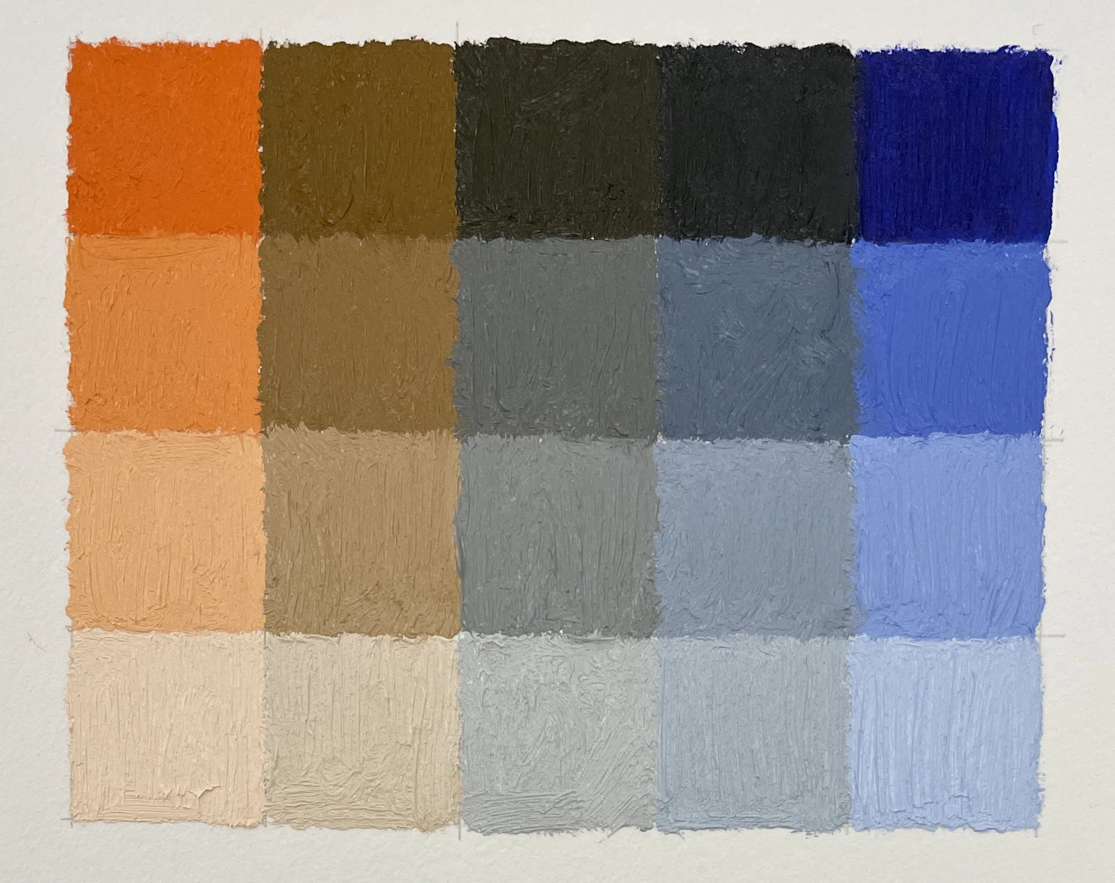 Our original value scale with Mars Black and Titanium White is tinted with a warmer pigment to create a column of warmer values. The column on the left becomes relatively cooler, compared to the new column on the right. We now have differences in Value, as well as Temperature. The cooler values will be reserved for any shadow planes or cast shadows on the painted study; the warmer tones will be applied to any planes that are facing, or being “touched” by, the source of light.
