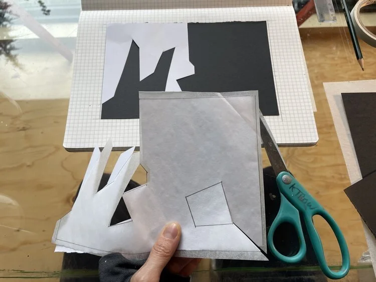 Now, using tracing paper over your drawing, trace those combined shapes. In my example, notice how the light on the back wall combines with the light plane of my center object, creating one larger shape. Place this tracing paper over your half sheet of white or black paper and cut out your shapes, creating a 2-Value collage, and it’s inverted self.